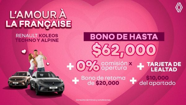 Descubre el lujo, la tecnología y el desempeño con la Renault Koleos Techno y Alpine. Aprovecha esta oferta exclusiva: recibe un bono de hasta $62,000, además de 0% comisión por apertura, un bono de retoma de $20,000 y $10,000 de apoyo a tu apartado. Suma también los beneficios de la Tarjeta de Lealtad. Sofisticación, potencia y una promoción que enamora. ¡Estrena el placer de conducir!