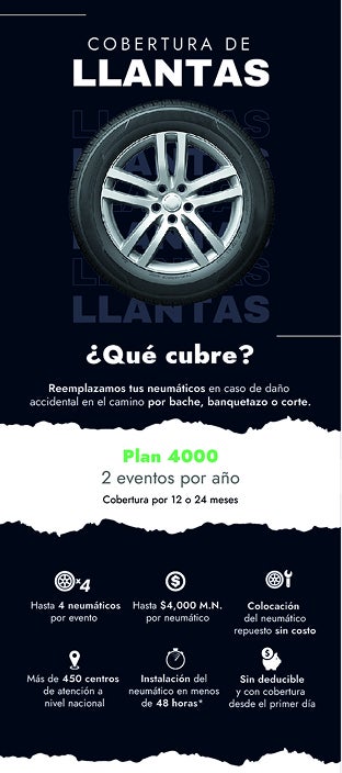 "Me salvaron con la cobertura de llantas cuando dañé una por un bache. Servicio excelente y rápido."
