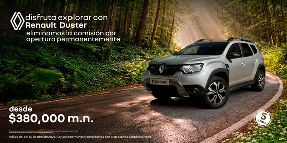 Atrévete a explorar nuevos horizontes con la Renault Duster, el SUV robusto diseñado para la aventura y el día a día. Como beneficio permanente, eliminamos la comisión por apertura en tu financiamiento, para que tu camino hacia ella sea más directo. Llévala con un precio desde $380,000 MXN y descubre su capacidad, espacio y versatilidad en cualquier terreno. Oferta válida del 1 al 30 de abril de 2026.