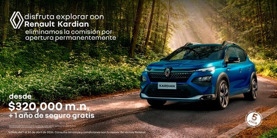 Atrévete a explorar nuevos caminos con el Renault Kardian, el SUV urbano que destaca por su diseño audaz, tecnología conectada y agilidad. Como beneficio permanente, eliminamos la comisión por apertura en tu financiamiento. Adquiérelo con un precio desde $320,000 MXN y disfruta de 1 año de seguro gratis incluido. Estilo, protección y una oferta que facilita tu decisión. Oferta válida del 1 al 30 de abril de 2026.