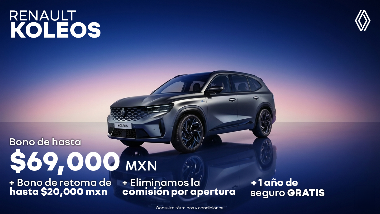 Estrena la Renault Koleos, la SUV de lujo que combina confort premium, tecnología avanzada y un diseño sofisticado. Aprovecha un bono de hasta $69,000 MXN, más un bono de retoma de hasta $20,000 MXN. Además, eliminamos la comisión por apertura en tu financiamiento e incluimos 1 año de seguro gratis. Elegancia, protección y una oferta que enamora.