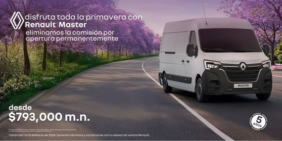 Celebra la primavera al volante de la Renault Master, la furgoneta profesional diseñada para la productividad y la durabilidad. Como beneficio permanente, eliminamos la comisión por apertura en tu financiamiento. Adquiérela con un precio desde $793,000 MXN y disfruta de 5 años de garantía para mayor tranquilidad. Capacidad de carga, robustez y confiabilidad para tu negocio o proyectos. Los precios pueden variar por modelo o versión.