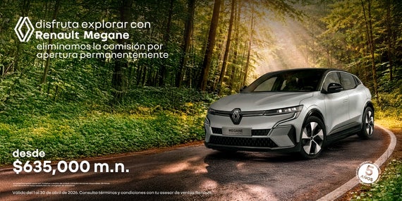 Atrévete a explorar con elegancia y sofisticación en el Renault Mégane, el sedán que combina diseño francés, tecnología avanzada y confort superior. Como beneficio permanente, eliminamos la comisión por apertura en tu financiamiento, para que disfrutes de este icónico vehículo sin cargos extras. Llévalo con un precio desde $635,000 MXN y descubre su rendimiento eficiente y estilo inconfundible. Oferta válida del 1 al 30 de abril de 2026.