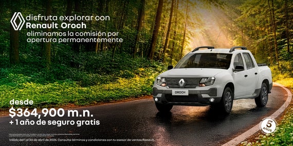Atrévete a explorar cada rincón con la Renault Oroch, la pickup urbana que combina estilo, versatilidad y capacidad de carga. Como beneficio permanente, eliminamos la comisión por apertura en tu financiamiento. Adquiérela con un precio desde $364,900 MXN y disfruta de 1 año de seguro gratis incluido. Ideal para el trabajo, la aventura o el día a día. Oferta válida del 1 al 30 de abril de 2026.