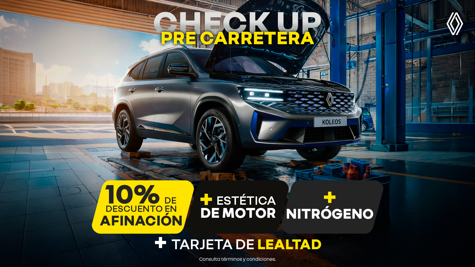 Antes de salir a la carretera, lleva tu Renault Koleos a nuestro Check Up Pre Carretera. Obtén un 10% de descuento en afinación completa, limpieza estética profunda del motor y aplicación de nitrógeno en tus llantas para mayor durabilidad y rendimiento. Además, disfruta de los beneficios exclusivos de la Tarjeta de Lealtad. Viaja seguro, con el mejor rendimiento y el cuidado que tu vehículo merece.