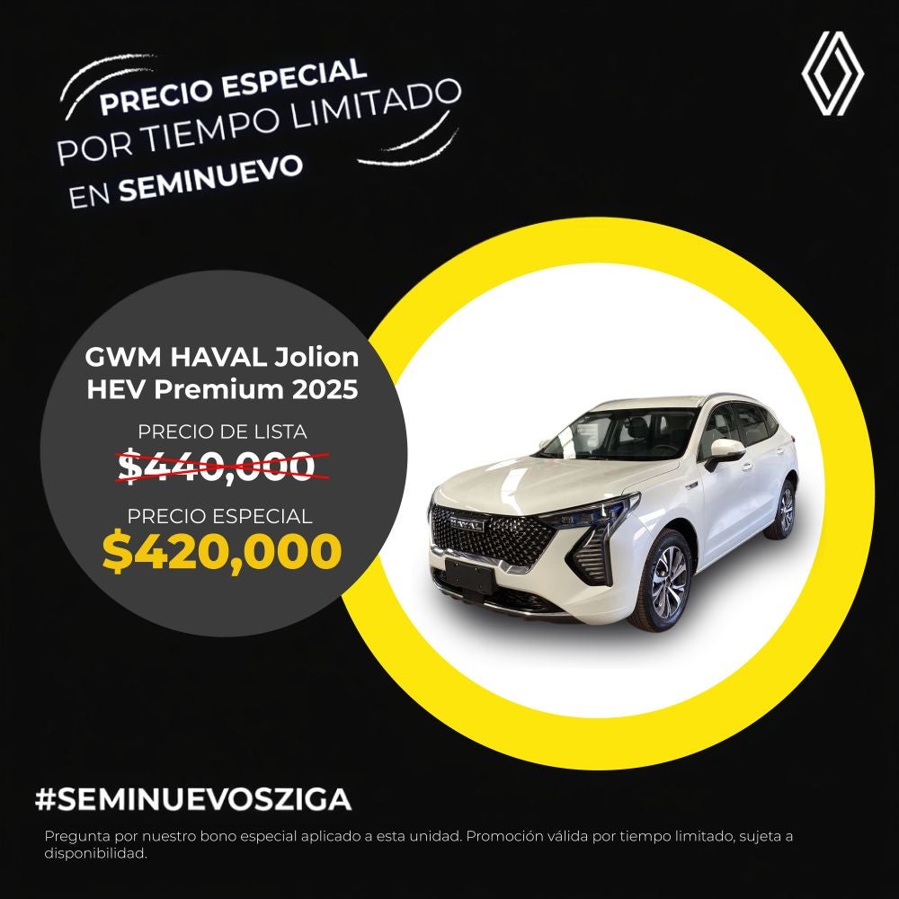 El precio mostrado ya incluye el bono aplicado. Válido únicamente para GWM Haval Jolion HEV Premium modelo 2025 seminuevo