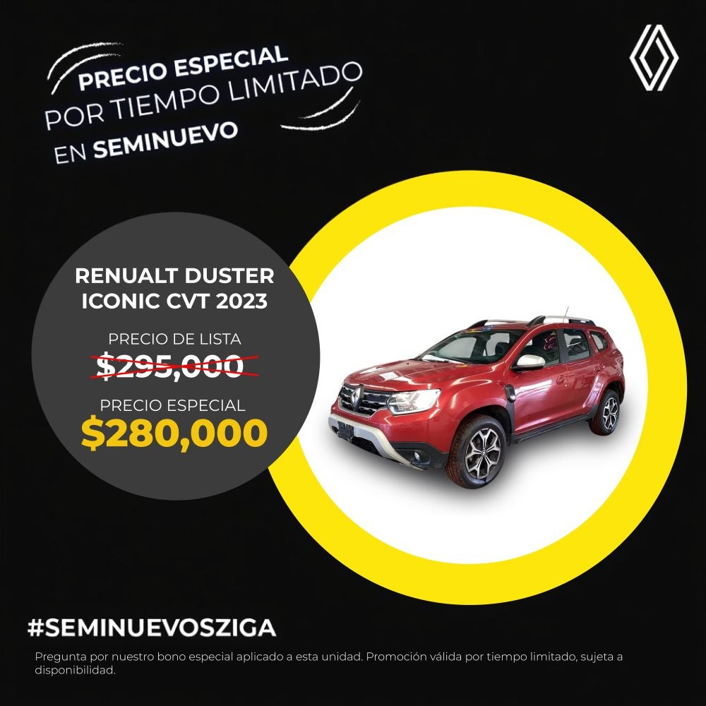 El precio mostrado ya incluye el bono aplicado. Válido únicamente para Renault Duster Iconic CVT modelo 2023 seminuevo.