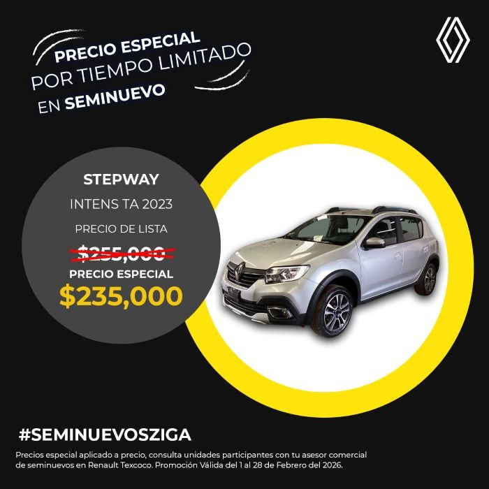 El precio mostrado ya incluye el bono aplicado. Válido únicamente para Renault Stepway Intens TA modelo 2023 seminuevo.
